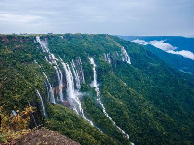 The "Seven Sisters Waterfall," also known as Nohsngithiang Falls or Mawsmai Falls, is a seven-segmented waterfall in Meghalaya, India, located near Mawsmai village in the East Khasi Hills district, and is a major tourist attraction.